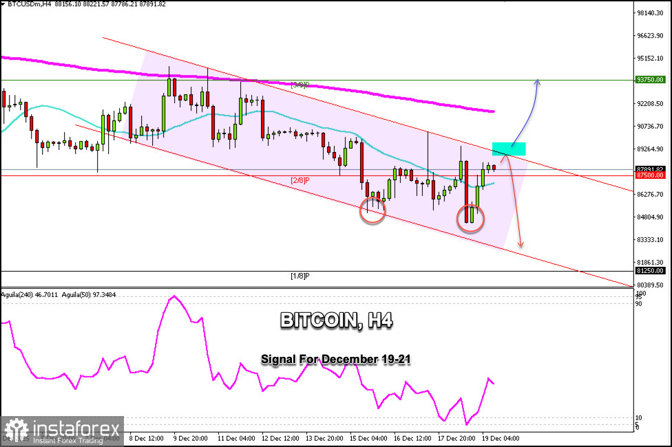 19.12.2025 04:21 PMيتداول البيتكوين حول مستوى 87,891 دولار بعد انخفاض حاد إلى 84,323 دولار أمس خلال الجلسة الأمريكية. نحن نشهد الآن تعافيًا وتماسكًا فوق مستوى 2/8 Murray وفوق المتوسط المتحرك البسيط 21، مما يشير إلى احتمال اختراق القناة الهابطة.