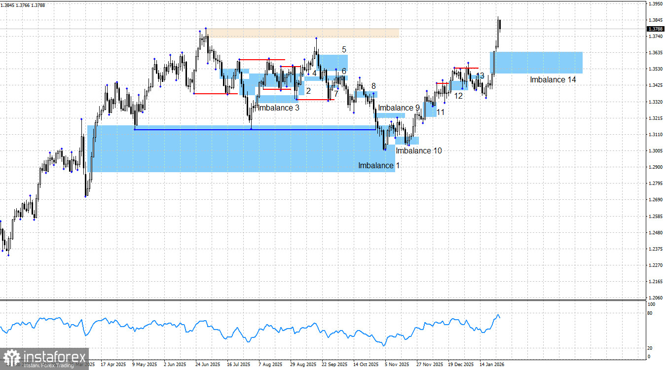 Since the bullish trend is undeniable, traders are left to trade to the upside using clear patterns and well-defined signals. In the near future, traders may expect a return of prices into imbalance No. 14 and the formation of a new bullish signal. I previously considered the 1.3725 level as a potential upward target; this level has been reached, but the pound may rise much higher in 2026—especially given the events of the first month of the year. If bearish patterns form, short trades may also be considered, but within a bullish trend, I remain a proponent of buying rather than selling.
