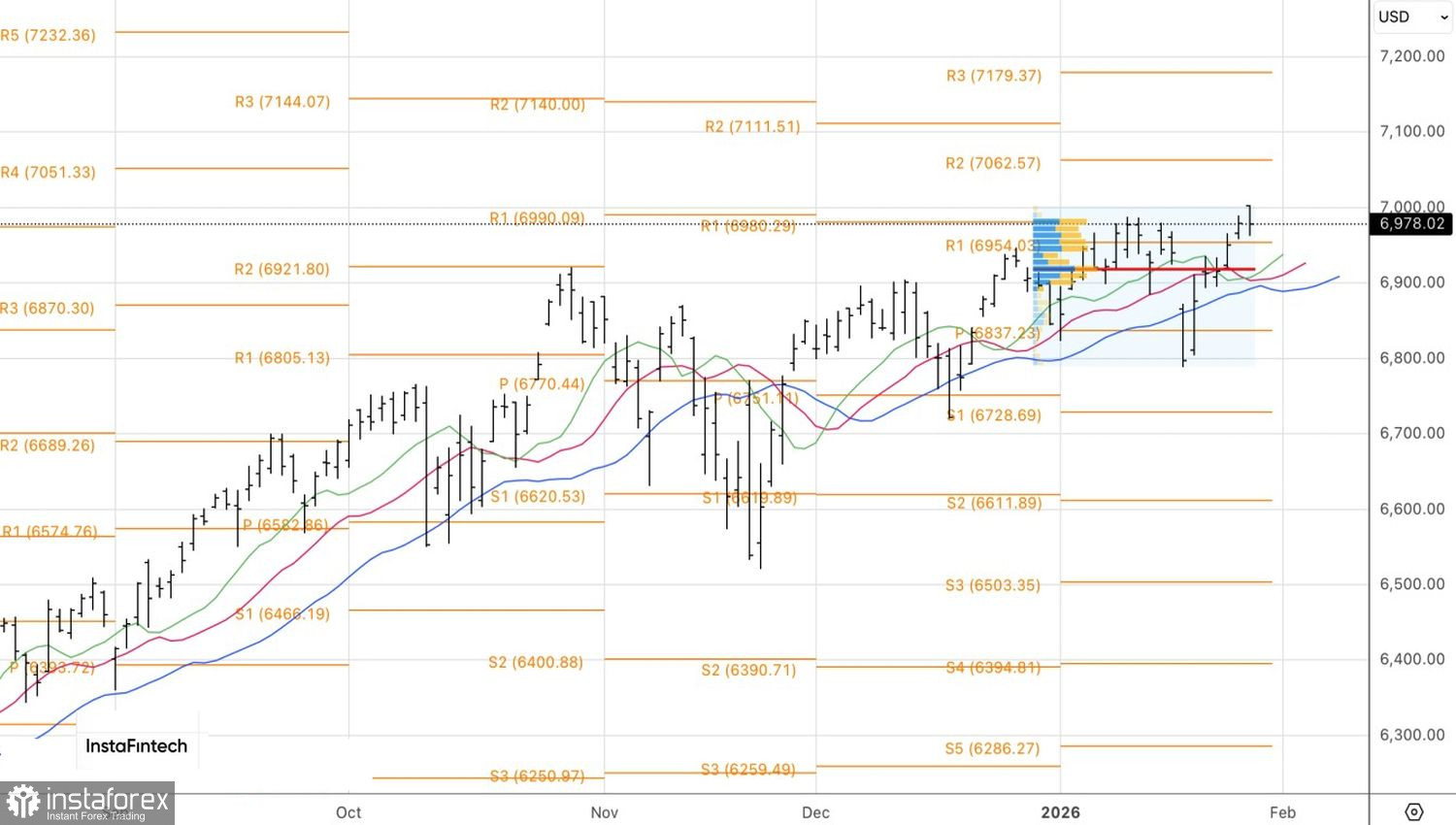Благодаря оптимизму инвесторов в отношении финансовых результатов, S&P 500 сумел преодолеть психологически важную отметку 7000. На это широкому фондовому индексу потребовалось 302 дня. Данный уровень превращается в своеобразную красную линию. «Быки» утверждают, что он был достигнут сильным импульсом прибыли, и акции продолжат ралли. «Медведи» акцентируют внимание, что они стали еще дороже.