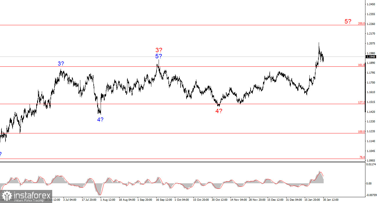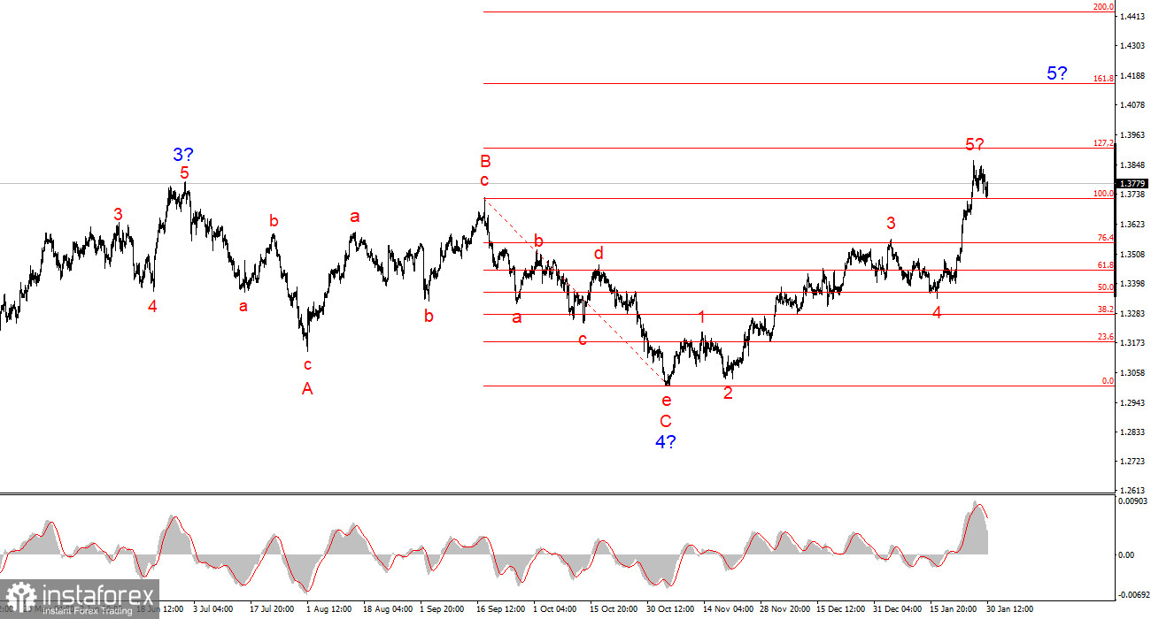 Волновая картина инструмента GBP/USD приобрела более понятный вид. В данное время продолжается построение предполагаемой волны 5 в 5, но внутренняя волновая структура глобальной волны 5 может принять гораздо более протяженный вид. Я считаю, что текущий повышательный набор волн близится к своему завершению или уже завершен. Следовательно, в ближайшее время может начаться построение коррекционной волны или набора волн, после завершения которого основной тренд, вероятнее всего, возобновится с целями, расположенными выше 39-й фигуры.