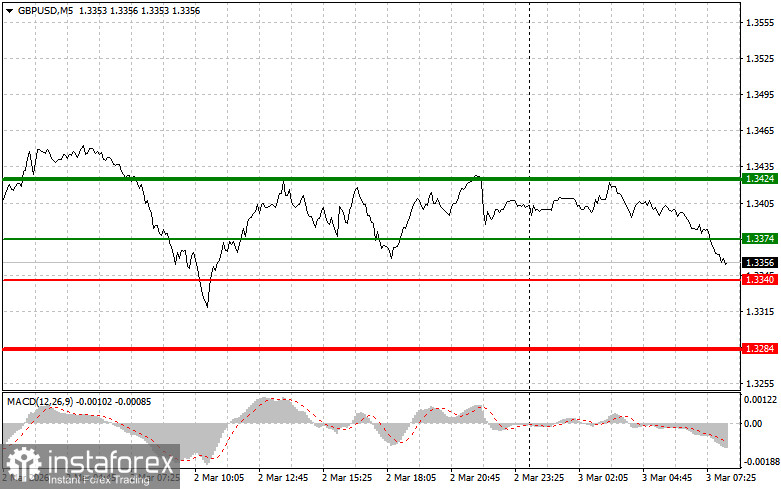 Сценарий №2: покупать фунт сегодня также планирую в случае двух подряд тестов цены 1.3340 в момент, когда индикатор MACD будет находиться в области перепроданности. Это ограничит нисходящий потенциал пары и приведет к обратному развороту рынка вверх. Можно ожидать рост к противоположным уровням 1.3374 и 1.3424.