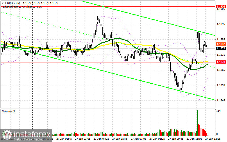 В своем утреннем прогнозе я обращал внимание на уровень 1.1870 и планировал от него принимать решения по входу в рынок. Давайте посмотрим на 5-минутный график и разберемся с тем, что там произошло. Снижение в район 1.1870, но получит подходящую точку входа в рынок так и не удалось, так что я остался без сделок. На вторую половину дня техническая картина была пересмотрена.
