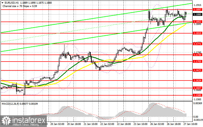 В ходе американской сессии ожидаются отчеты по еженедельному изменению занятости от ADP в США, индикатору потребительской уверенности и индексу цен на жилье в 20 крупнейших городах. Только очень хорошие показатели могут помочь доллару немного восстановить позиции. В случае давления на пару EUR/USD, лишь формирование ложного пробоя в районе ближайшей поддержки 1.1852 даст точку входа в длинные позиции в расчете на продолжение развития бычьего рынка с ростом к сопротивлению 1.1897. Прорыв и обратный тест этого диапазона сверху вниз станут подтверждением правильной точки вход с движением к области 1.1934. Самой дальней целью будет уровень 1.1973, где буду фиксировать прибыль. При варианте снижения EUR/USD и отсутствия активности в районе 1.1852, евро может просесть более крупно. Это приведет к снижению в район 1.1810. Лишь после формирования там ложного пробоя собираюсь действовать на покупку евро. Открывать длинные позиции сразу на отскок планирую от 1.1771 с целью восходящей коррекции в 30-35 пунктов внутри дня.