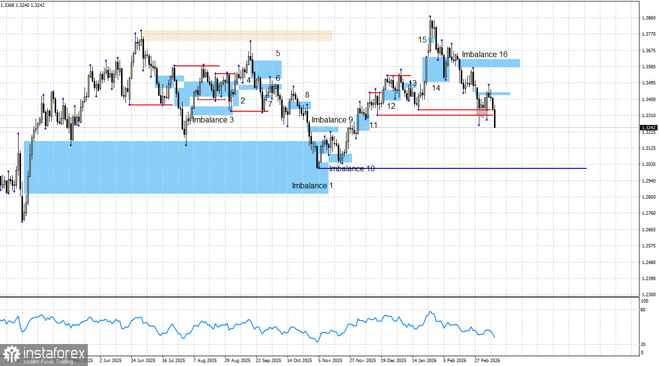 Отмечу, что падение британца в последние несколько недель получилось настолько сильным из-за неудачного стечения обстоятельств. Если бы Дональд Трамп не обещал через день атаковать Иран, не отправлял военные корабли в Персидский залив, а затем не начал войну, мы бы вряд ли увидели такой сильный рост доллара. Я считаю, что это падение может завершиться также неожиданно, как и началось. Однако в данное время оно продолжается, а цена получила реакцию на последний «медвежий» имбаланс. Прогнозировать падение британца до конкретных уровней при текущем нестабильном информационном фоне я не берусь.