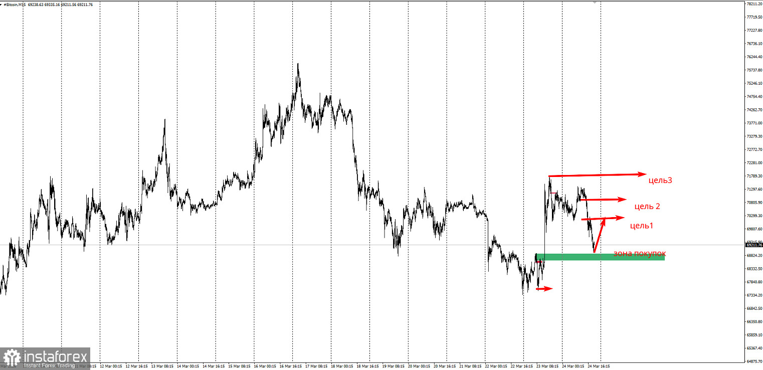 Риски ограничить 67500. Прибыль зафиксировать на пробое 70100, 70800 и 71800.