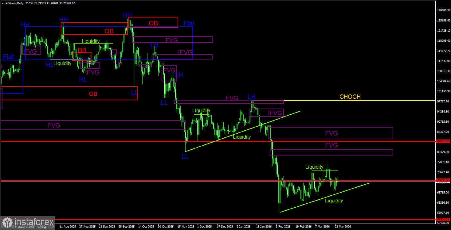 Биткоин продолжает формирование полноценного нисходящего тренда. Мы продолжаем ожидать падения с целью 57 500$(уровень 61,8% по Фибоначчи от трехлетнего восходящего тренда), а признаков разворота тренда в данное время ни одного. Но даже уровень 57 500$ теперь не выглядит, как конечная остановка. Из областей POI в данное время можно отметить только ближайший «медвежий» FVG на дневном ТФ, который располагается достаточно далеко от цены. На 4-часовом ТФ характер движения биткоина обладает всеми признаками флэта. Снизу остается очевидная цель – пул ликвидности ниже линии тренда на дневном ТФ.
