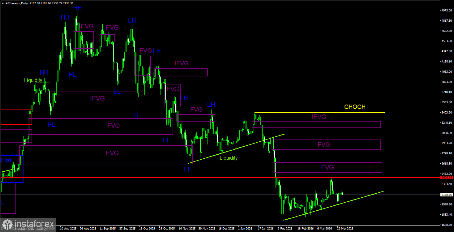На дневном ТФ продолжается формирование нисходящей тенденции. Ключевым паттерном на продажу выступал и выступает «медвежий» Order-block на недельном ТФ. Как мы и предупреждали, движение, спровоцированное этим сигналом, может быть сильным и длительным. После его формирования эфир уже подешевел на 55% или на 2 500$. В ближайшее время по-прежнему можно ожидать восходящую коррекцию, Order-block на 4-часовом ТФ отменен, криптовалюта покинула боковой канал. На 4-часовом ТФ в понедельник был сформирован «бычий» FVG, на который цена среагировала. Поэтому в ближайшее время рост может быть продолжен к «медвежьему» FVG, от которого может начаться новый виток падения.