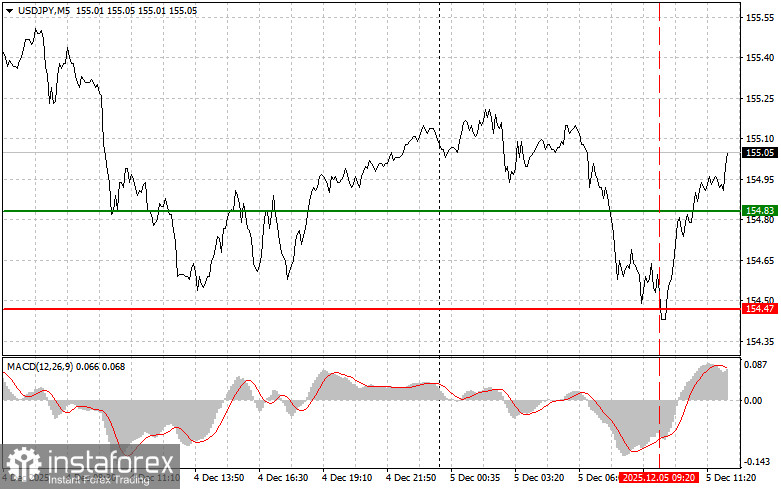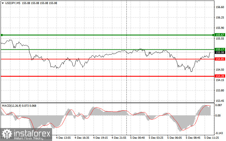 Сценарий №2: покупать USD/JPY сегодня также планирую в случае двух подряд тестов цены 154.85 в момент, когда индикатор MACD будет находиться в области перепроданности. Это ограничит нисходящий потенциал пары и приведет к обратному развороту рынка вверх. Можно ожидать рост к противоположным уровням 155.17 и 155.67.