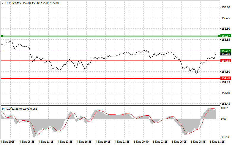 Сценарий №2: продавать USD/JPY сегодня также планирую в случае двух подряд тестов цены 155.17 в момент, когда индикатор MACD будет находиться в области перекупленности. Это ограничит восходящий потенциал пары и приведет к обратному развороту рынка вниз. Можно ожидать снижения к противоположному уровню 154.85 и 154.28.