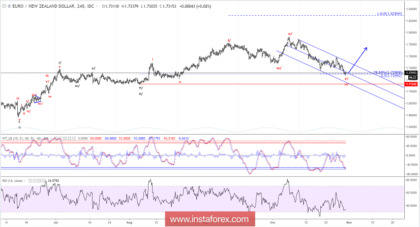 31.10.2018 05:14 PMHemos visto la caída esperada más cerca del soporte en la zona de 1.7290 - 1.7300 (el mínimo se ha visto en 1.7267). A corto plazo, una ruptura encima de la resistencia menor en 1.7333 será el primer buen indicio de que la caída correctiva en la onda roja ii se ha completado y la onda iii está lista para apoderarse del rally hacia 1.8253.