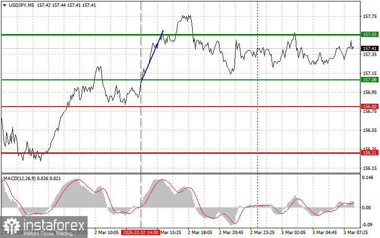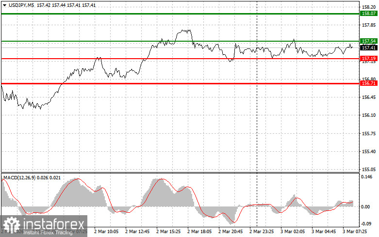 Сценарий №2: покупать USD/JPY сегодня также планирую в случае двух подряд тестов цены 157.19 в момент, когда индикатор MACD будет находиться в области перепроданности. Это ограничит нисходящий потенциал пары и приведет к обратному развороту рынка вверх. Можно ожидать рост к противоположным уровням 157.54 и 158.07.