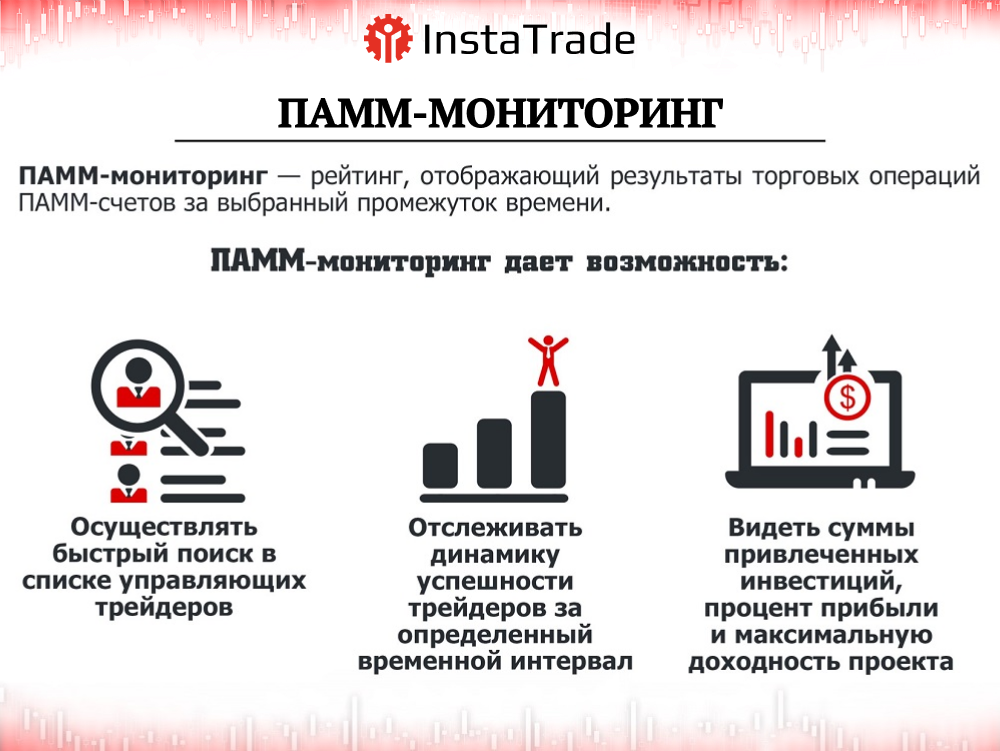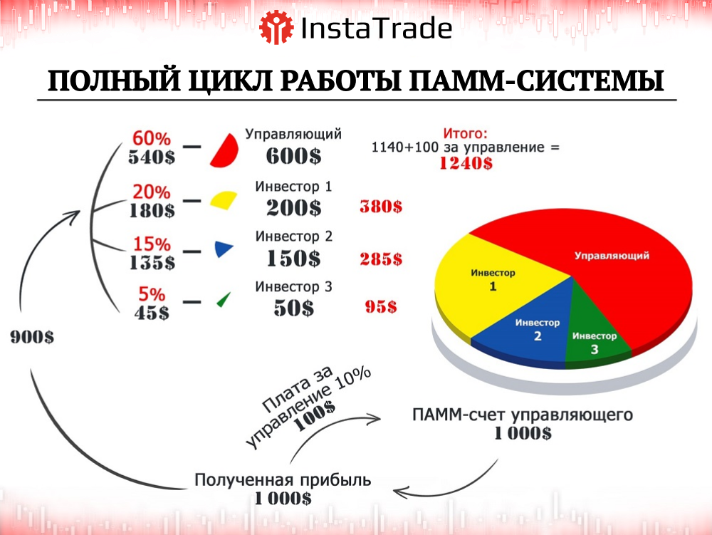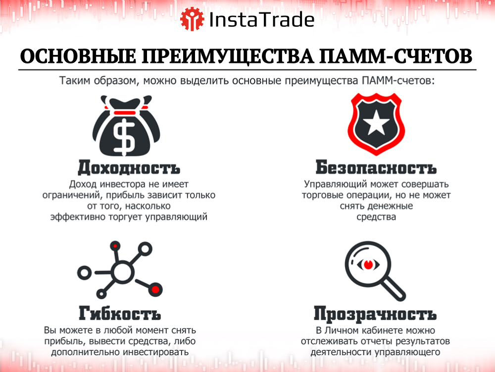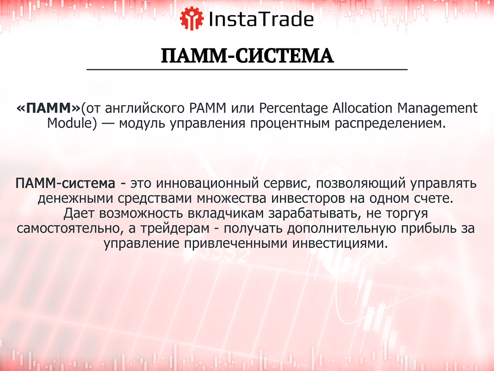 | 3 | Mijoz kabinetida PAMM-tizimi uchun anketani to'ldirgandan so'ng Siz PAMM-tizimning to'laqonli ishtirokchisi bo'lasiz. O'z savdo hisob-varag'ingiz uchun PAMM-tizimida qanday rolini (Treyderni yoki Investorni) tanlab olganingizga bog'liq hoda Siz yo investitsiyalarni qabul qilishingiz, yoki boshqa treyderlarga investitsiya kiritishingiz kerak bo'ladi, ular bosh saytda monitoring sahifasida yoki mijoz kabinetida PAMM-treyderlar monitoringi bo'limida aks etadi. |